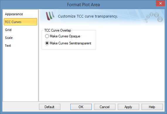 Options on this tab format all curves in the TCC plot as opaque or semitransparent. When curves are selected as opaque, the individual curves can be brought forward or sent backward. This is not applicable when the curves are semitransparent.