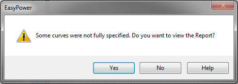 Click Yes to produce a report informing you of areas not specified for the items that coordination is unable to plot and the data that is missing. If you click No, EasyPower does not plot the TCC curve for that item. If more than one item is selected to plot TCC curves, then only the items not fully specified are eliminated from the plot.