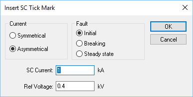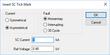 Enter the short circuit current value in kilo amps The tick mark is placed on the TCC plot at the specified current value times the ratio of short circuit reference voltage to TCC plot reference voltage. |
