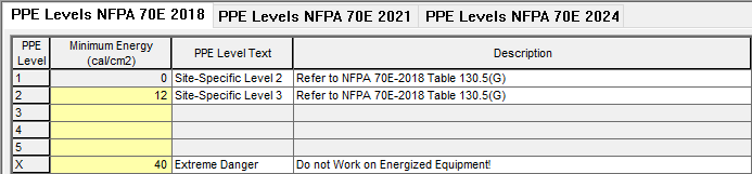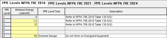 You can work with a limited number of PPE (Personal Protective Equipment) levels for clothing classes. Clothing classes for incident energy calculations reference NFPA 70E table 130.5(G).