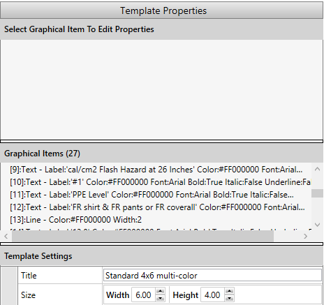 Graphical Items: This list shows all graphical items on the label template. The currently selected graphical item is highlighted in the list. This list can also be used to select a specific item on the template if it cannot easily be clicked on.