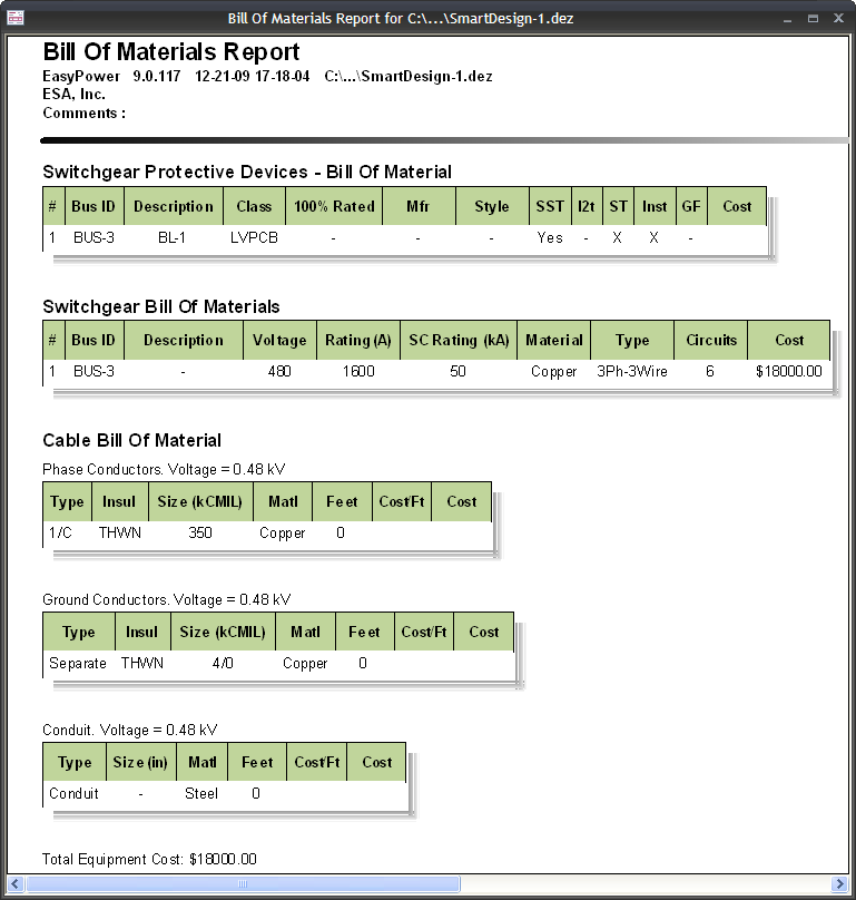 The Bill of Material Report consists of a group of tables organized by equipment type. The different equipment tables are Transformers, Protective devices grouped by bus equipment type, Bus equipment type, and Cables. The Transformer and Cable Bill of Material tables combine all similar equipment and gives a total cost based on number of units or total cost for all similar conductors. For Bus Equipment and Protective devices, each piece of equipment will be found as a line item, with Bus name or protective device name specified along with the individual cost of the item.