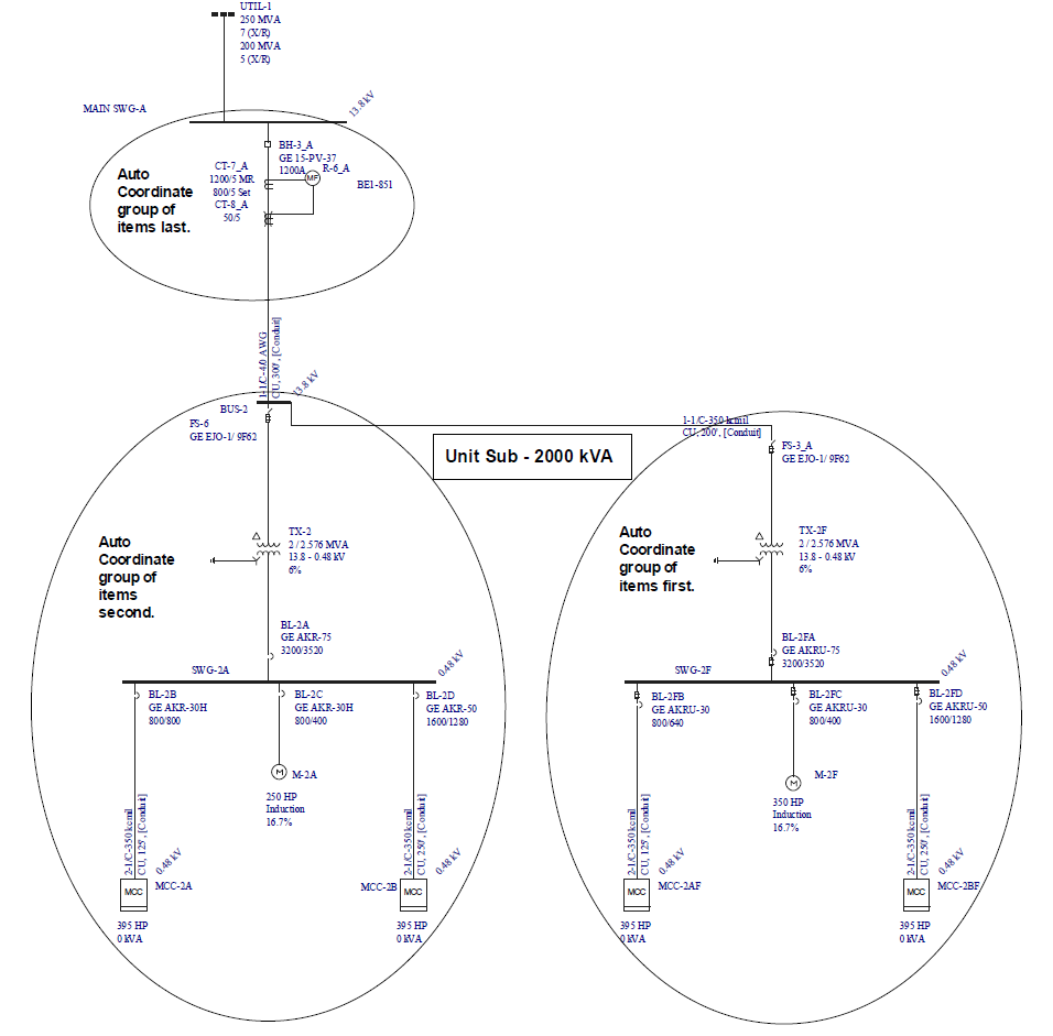 When using auto coordination to coordinate your complete model, it is best to start at the downstream devices, and then work upstream, so all dependent devices are coordinated properly. Using this process, you do not need to re-coordinate a device that has already been coordinated. The figure below shows a typical method of steps for auto coordination. It shows three groups of items to coordinate. Begin by auto coordinating the items in the circle on the bottom left of the one-line. Read through the Auto Coordination Report and verify all protective device settings are coordinated to meet your standards. Repeat this process for the group of items on the lower right side of the one-line. At this point, the lower portion of the one-line is properly coordinated. It is now time to auto coordinate the relay in the circle at the top of the one-line, since all dependent protective devices are properly coordinated. Again, read through the Auto Coordination Report to observe the comments.