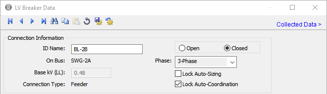 The LV Breaker Data dialog box for each protective device has a Lock Auto-Coordination check box to prevent data changes that are possible through auto coordination.