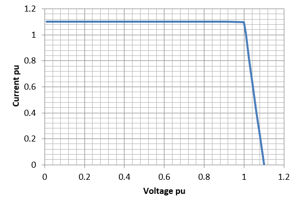 The graph below shows an approximation of the V-I characteristics of photovoltaics. This is nonlinear and is used when solving power flow. As the load demand increases beyond the capacity of the photovoltaic, the voltage drops rapidly.