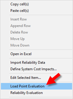 To perform load point evaluations, in the Reliability Database View, right-click on a row or cell for a load, and then click Load Point Evaluation.