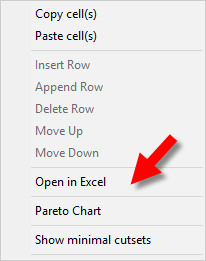 After the results are displayed, you can open the results in Excel, display a Pareto chart, or display the minimum cut set. To do this, right-click on a cell, and then select the option you want to use.