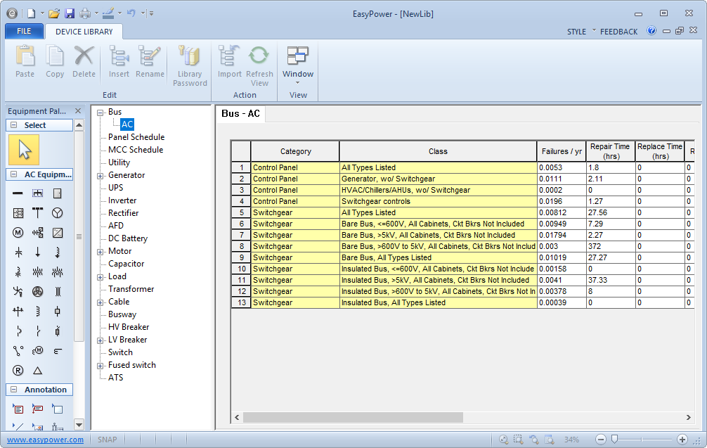 The EasyPower installation automatically includes a copy of the IEEE 493-2007 Annex Q library data for use with the Reliability module. The Annex Q library comprises empirical data regarding component reliability and is helpful to populate your database with reliability information. See Importing Reliability Data for more information.