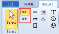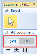 The Equipment Palette and the Insert tab have options to insert three-phase (3PH) or single-phase (1PH) items onto the one-line. Three-phase is the default selection.