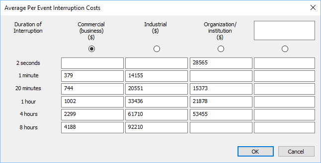 - You can specify the average interruption costs per outage event using the Define System Cost Impacts option. You can specify the business type of your system and input costs for varying intervals. You can also create your own custom business type and costs.