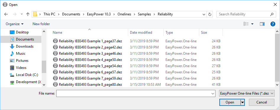 - There are several sample one-lines that demonstrate the Annex Q examples. You can find them in the C:\Users\{username}\Documents\EasyPower 10.3\Onelines\Samples\Reliability folder.