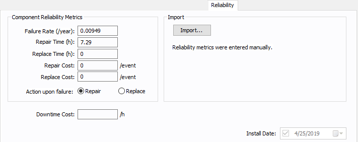 - The individual equipment data dialog boxes include a Reliability tab where you can view or edit your reliability data. You can import data or manually edit individual items here.