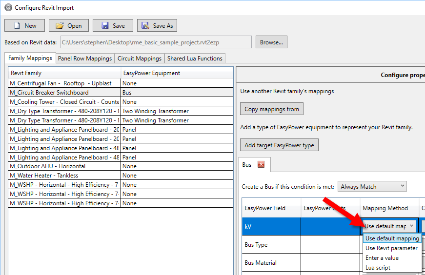 - When you import Revit data into EasyPower, you can map the incoming data using default values, Revit parameters or values, manually entered values, or Lua scripts.