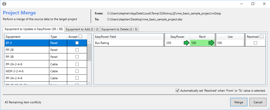 - You can merge changes from an updated Revit project to your EasyPower one-line. You have control over which data is merged and whether to use the Revit data or to retain the EasyPower data.
