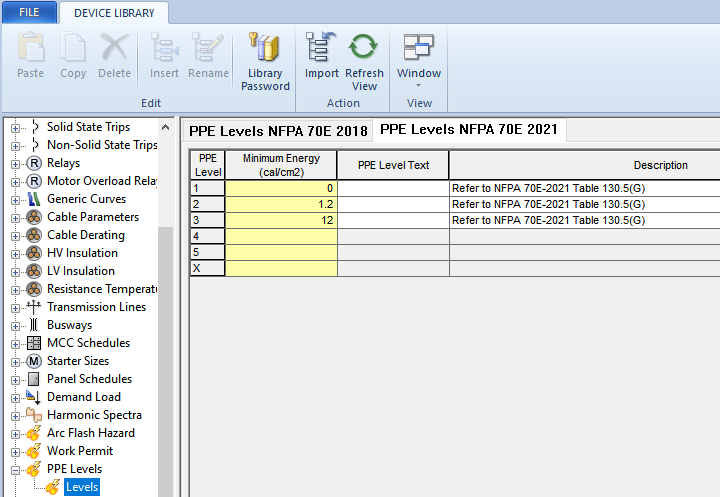 Figure 27: PPE Levels for NFPA 70E 2021 in the Device Library