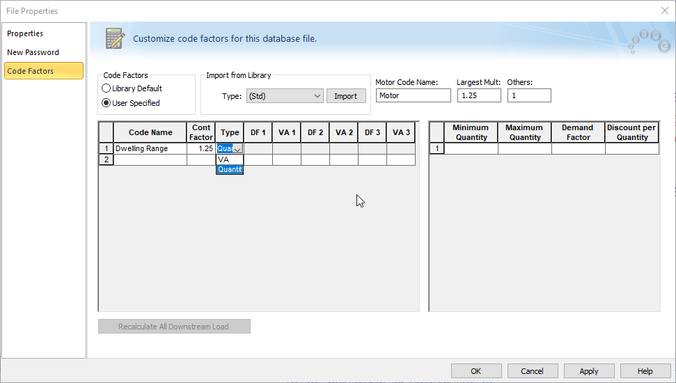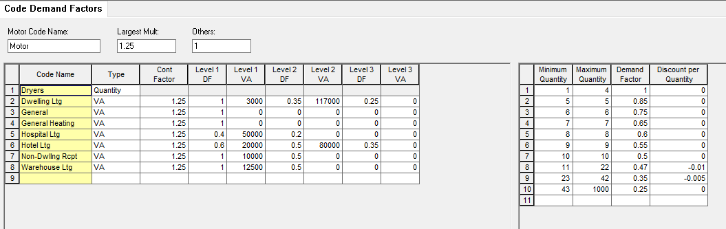 Load calculations now enable you to specify load categories for which the demand factors can vary with the number of items. You can define demand factors (code factors) based on the quantity in the Demand Load section of the library or in the File Properties under Code Factors.