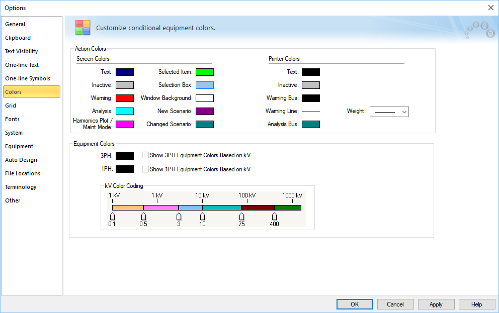 You can select a specify a color for all three-phase (3PH) or single-phase (1PH) equipment on the one-line. You can also select the Show Equipment Colors Based on kV check box for each phase type to have the equipment display different colors based on voltage. You can do this for three-phase equipment, single-phase equipment, or both.