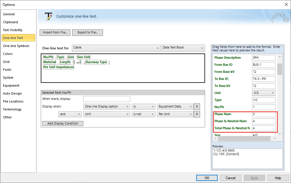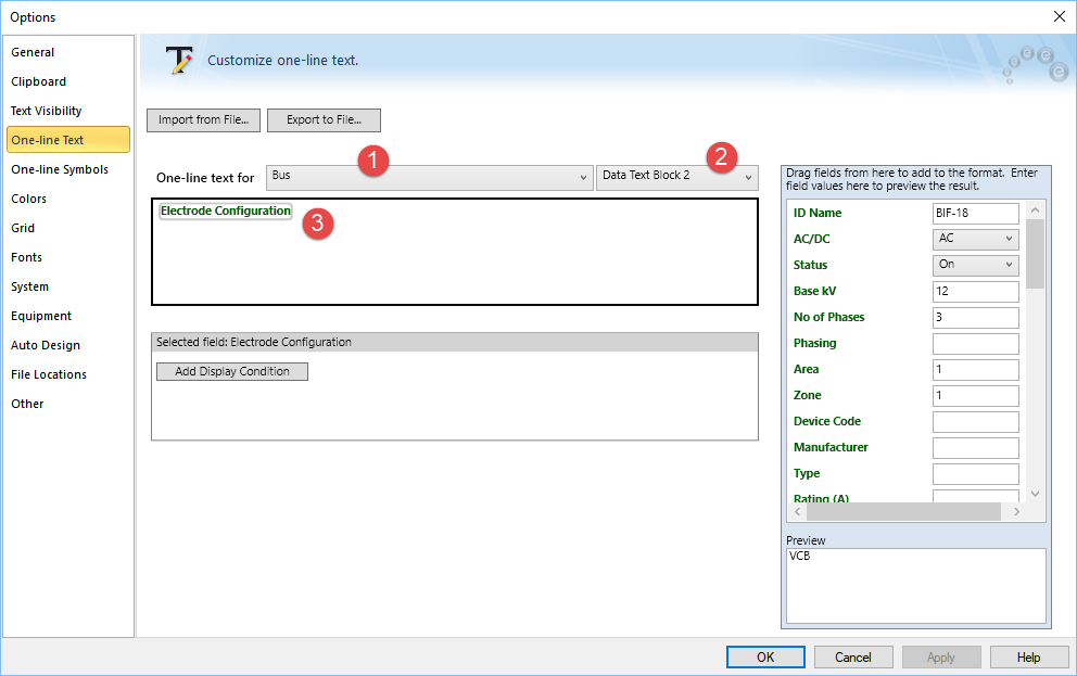 You can now add a second data text block for buses to the one-line text template. You can use the text editor to select which additional information you want to appear in the data text block on the one-line. The text block is blank by default.