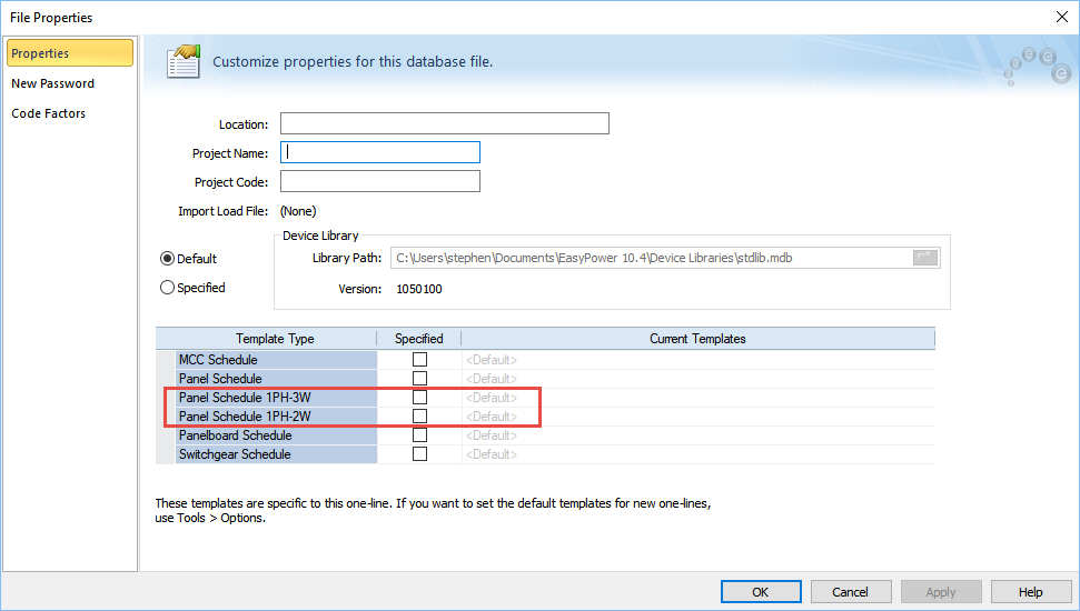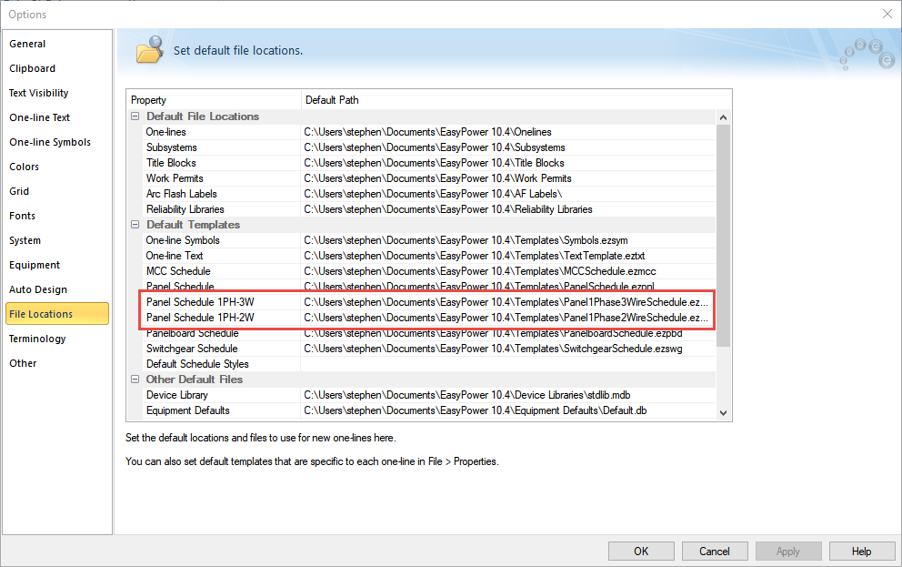 There are new panel schedule templates for 2- and 3-wire panel schedules. You can set the file location for these files globally in the system Options on the File Locations tab or for individual one-lines in the File Properties on the Properties tab.