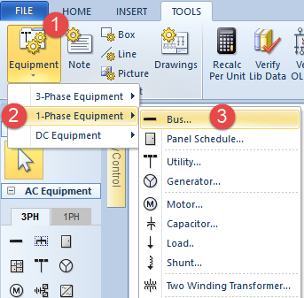 The Equipment Palette and the Insert tab have options to insert three-phase (3PH) or single-phase (1PH) items onto the one-line. Three-phase is the default selection.