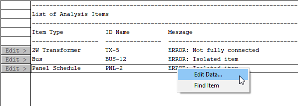 - Right-click on the item in the report to display a context-sensitive menu that enables you to either open the data dialog box or find the item on the one-line.