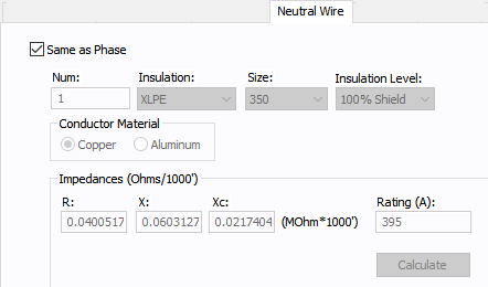 - If you clear the Same as Phase check box, you can enter the cable specifications for the neutral wire. If the Number of Neutral Wires is set to 0, the program uses the impedance of the phase cable.
