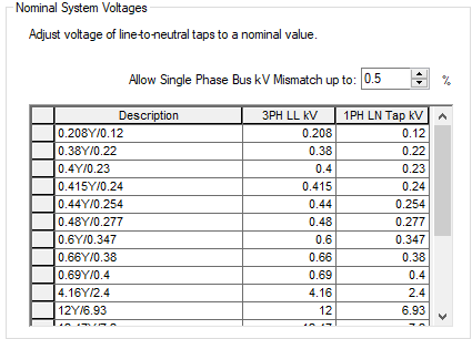 Line-to-neutral voltage of three-phase distribution systems is equal to the base kV divided by √3. This table in Options on the System tab can be used to adjust the single-phase tap voltage to a nominal value. If the base kV of the three-phase equipment is not identified in this table, the line-to-neutral tap voltage of single-phase equipment defaults to the base kV divided by √3. An additional setting is provided to allow for a voltage mismatch tolerance when connecting single-phase equipment to three-phase systems.