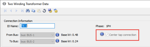 Figure 8: Center Tap Connection Check Box Selected on a Single-Phase Transformer