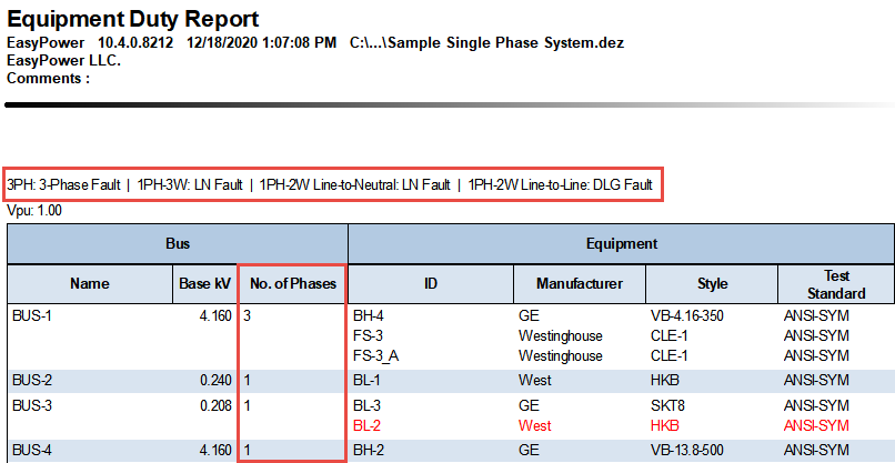 There is a new column on the Equipment Duty Report to display the number of phases when the option to display the number of phases is selected. The report header now includes fault type information for both three-phase and single-phase buses.