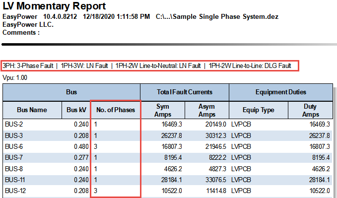If the option is selected to include the number of phases on short circuit reports, the reports include a column for the number of phases, and the base kV reflects the appropriate value for the phase. This applies to both ANSI and IEC reports.