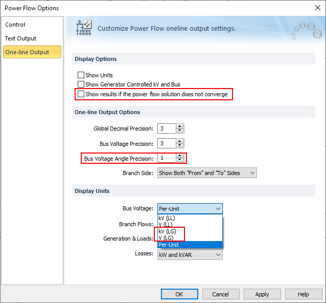 The Power Flow Options - One-line Output tab has new options to show results if the power flow solution does not converge, and enables you to specify bus voltage angle precision. The bus voltages can now be displayed in line-to-ground units.