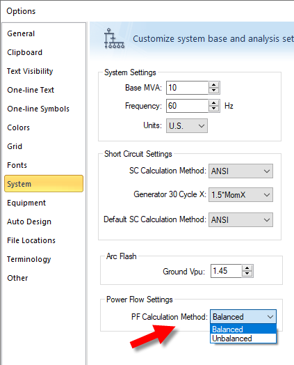 If your EasyPower license includes the power flow feature, you will see a new option to specify the Power Flow Calculation Method in Tools > System > Options. You can choose from Balanced or Unbalanced.