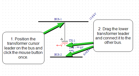 Two Winding Transformer on the Equipment Palette or Insert tab—the pointer changes to a two winding transformer symbol. - Place the transformer by positioning the transformer pointer's top leader on the top bus and clicking once. The transformer