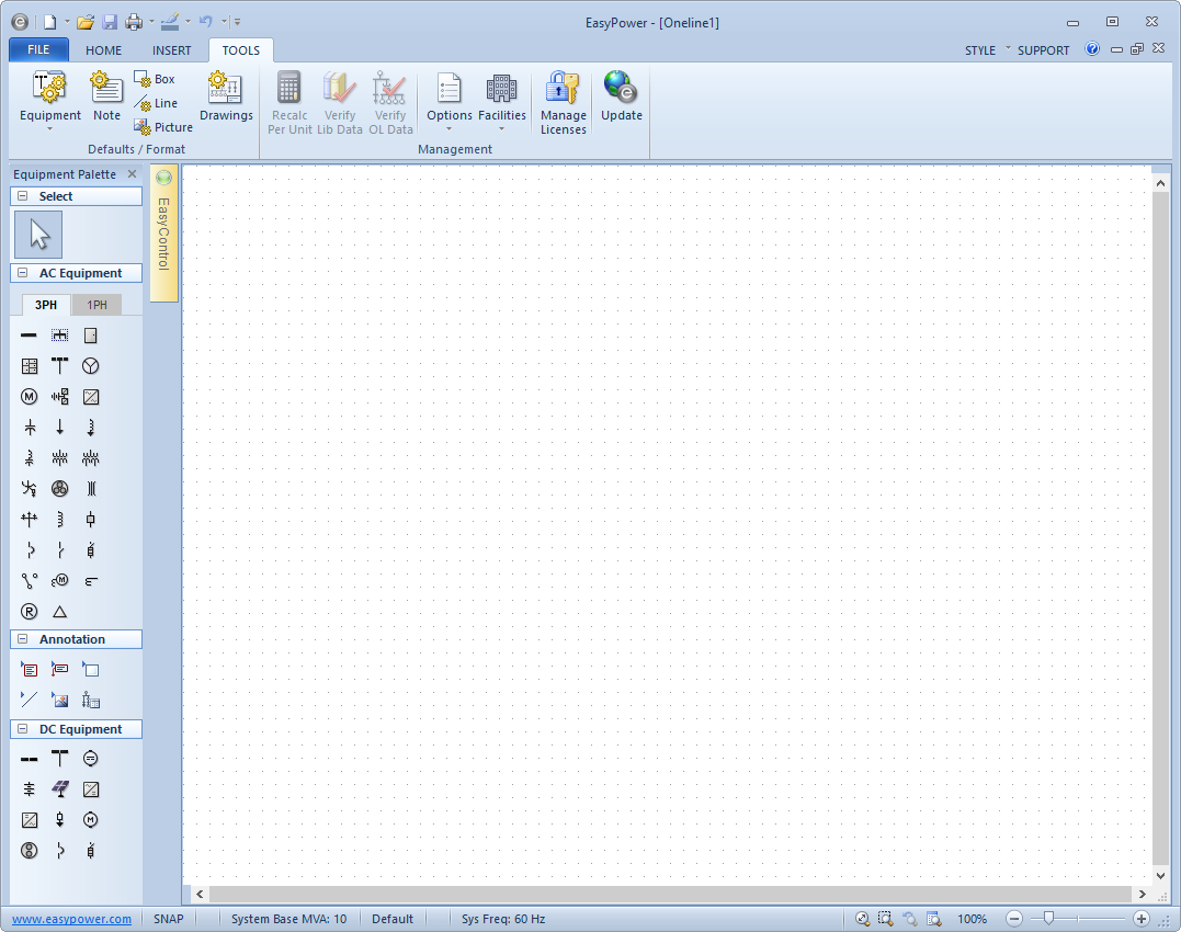 After starting EasyPower, click File > New > New Oneline to open a blank one-line diagram in the session window.