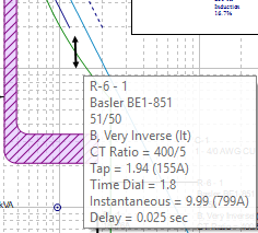 Hover over the relay R-6 in the TCC plot until a double-headed arrow appears, and then drag the curve up and down. The relay time dial changes dynamically. The tooltip indicates the latest time dial setting.