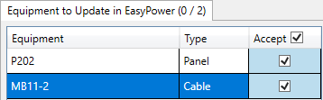 Note that there can be multiple tabs at the top of the dialog for equipment to update, add, or delete. In this example, there is only one: Equipment to Update in EasyPower. When you are merging your own files, make sure to watch for the additional tabs.
