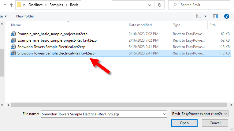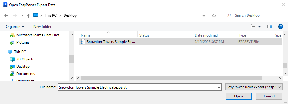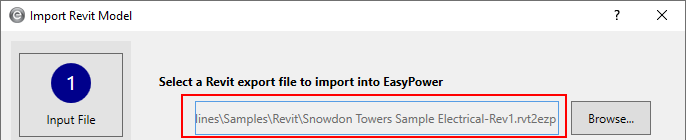 With Input File selected, click Browse, and then browse to the C:\Users\{username}\Documents\EasyPower 11.1\Onelines\Samples\Revit folder and select the Snowdon Towers Sample Electrical-Rev1.rvt2ezp file. This file includes changes that have been made to the Revit project. Click Open.