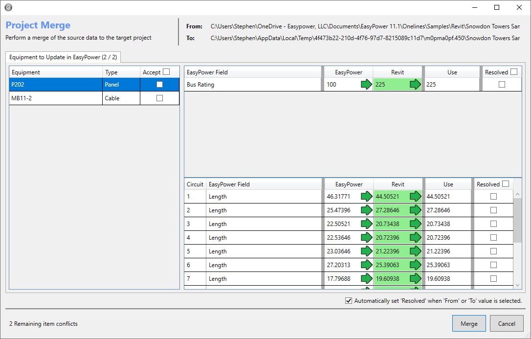 - You can continue selecting the values you want to merge into the EasyPower one-line. When you are finished, click Merge, and then click Yes. Any items where you do not click the Accept check box are ignored by the merge. When the merge is complete, click Close. The program displays a report to tell you what has changed.