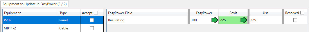 - On the Equipment to Update in EasyPower tab, select the first equipment item, panel P202. Notice that the EasyPower column displays a bus rating of 100 but the Revit column, which is highlighted green, displays 225, and the Use column displays 225 (which is the Revit value). You can select the value you want to use by clicking on it.