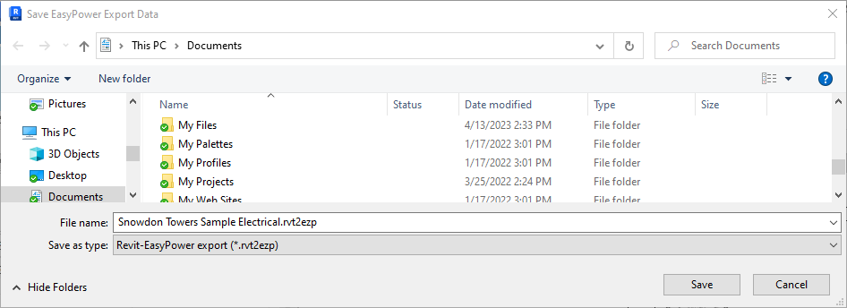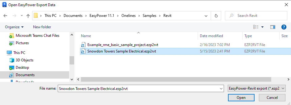 - Select the file that was exported from EasyPower, and then click Open. For the purpose of this tutorial, you can use the Snowdon Towers Sample Electrical.ezp2rvt file stored in C:\Users\{username}\Documents\EasyPower 11.1\Onelines\Samples\Revit.