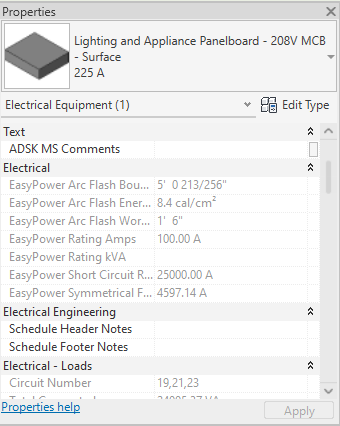 - Select a panelboard on the drawing and then look at the Properties pane on the left. Notice all of the EasyPower values under the Electrical heading.