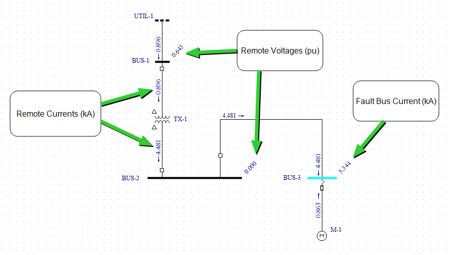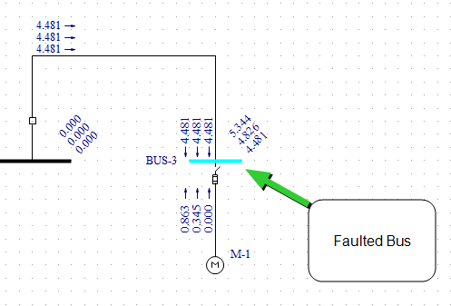 Double-click on BUS-3. The bus turns light blue and displays fault currents in symmetrical kilo-amps. As shown in Figure 1, the motor contributes 0.863 kA and the cable 4.481 kA to the fault. The total bus fault current, shown at a forty-five degree angle, is 5.344 kA.
