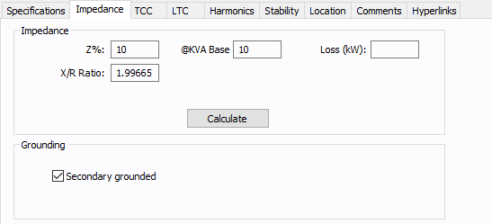 你也可以输入变压器数据表或铭牌的MVA或kVA的阻抗值。当手动输入一个值时,输入的值用于计算单位阻抗,而不是标准额定值。 |