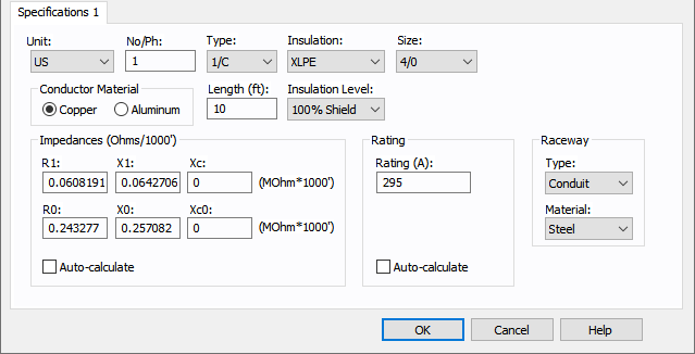为同一电路建模的电缆总数。这在业内也称为“电缆组”或“运行数”。“缺省的一(1)指每个相位有一个导体。两个(2)指每相并联两根导线,等等。当两个或多个导线并联时,该电路阻抗会按系数降低。在对话框中显示的阻抗仅为一根导线,并与个数/相无关,所以如果你输入这些阻抗值,而不是使用自动计算,请确保时一根导线的阻抗。这使可以轻松地核查手册值,无需额外的运算。在数据库中报告中列出的阻抗标幺值考虑了导线的总数。