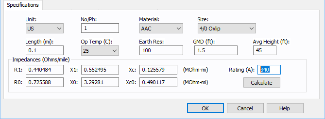 建模电缆的总数。默认值(1)指每相一根导线。两个(2)指每相并联两根导线,等等。当两个或多个导线并联时,该电路阻抗会按系数降低。在对话框中显示的阻抗仅是一根导线的阻抗值,而不是基于个数/相字段。如果你输入这些值而不是使用计算,确保它们仅用于一个导体。这使你可以轻松地核查手册值,无需额外的运算。此时计算按钮不会考虑分裂导线。 |