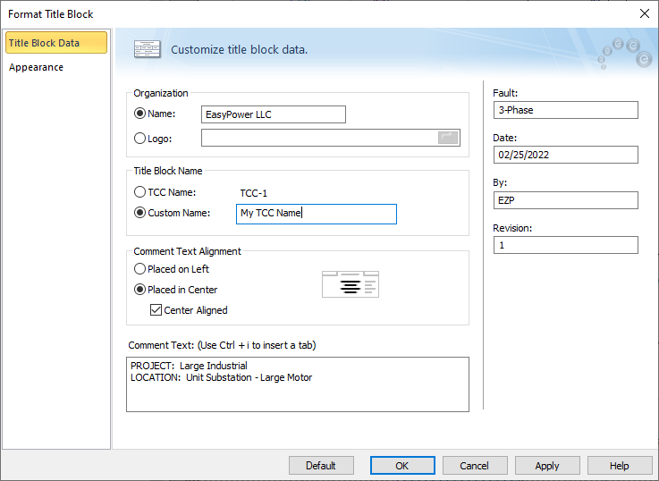 使用标题块数据选项卡,在标题块中输入想要输入的公司名称、TCC曲线名称、版本号、日期、文本对齐,以及任何评论。