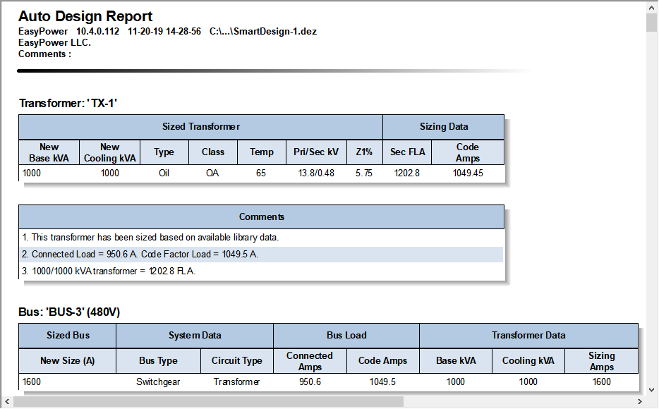 自动设计报告显示新的设备规格和为什么选择该规格。自动设计报告每次在自动运行设计的时候被创建。该报告将自动变为活动窗口。一个自动设计报告的例子如下所示。