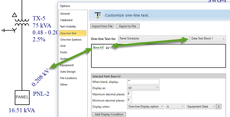 - 许多项都只有一个数据文本块,你可以来定义,但是盘面表格,MCCs,和工具点有两个.在单线图种第一个文本块显示第二个的上方