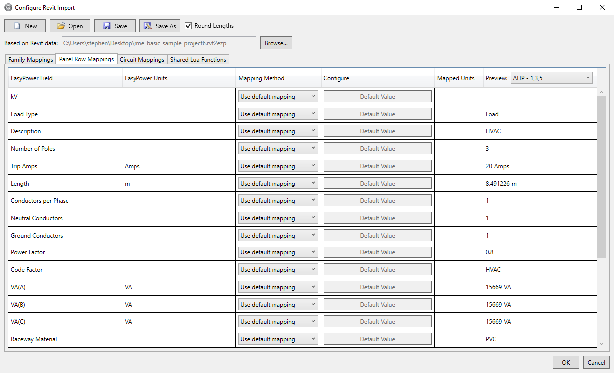 您可以映射面板行,并指定是使用默认值、Revit值、输入您自己的值,还是使用Lua脚本。当程序确定Revit元素属于面板时,它使用这种配置。
