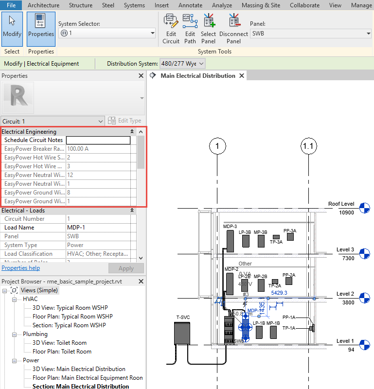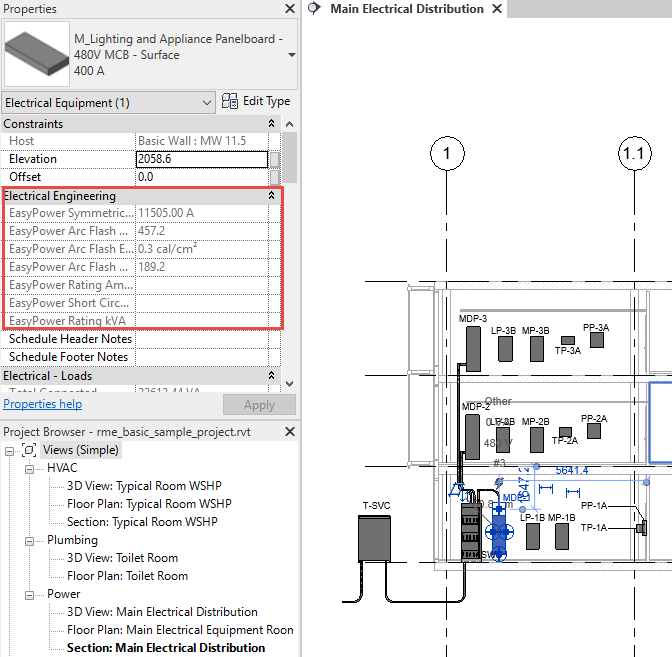 EasyPower 数据导入Revit后,您可以查看结果的准确性。如果需要,您可以重复这些步骤,使用另一个程序的数据不断更新这两个程序。